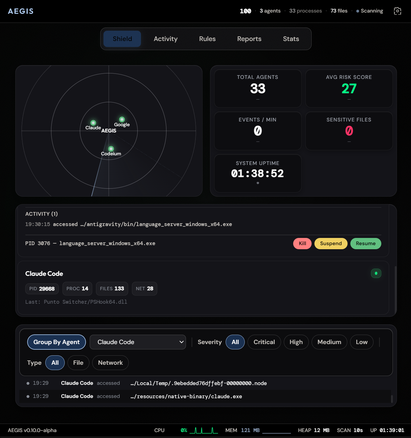 On startup Aegis registers syscall hooks for process creation, file I/O, and network sockets. It builds a live process tree of every agent on your machine and begins capturing events at the kernel level -- zero userspace overhead.