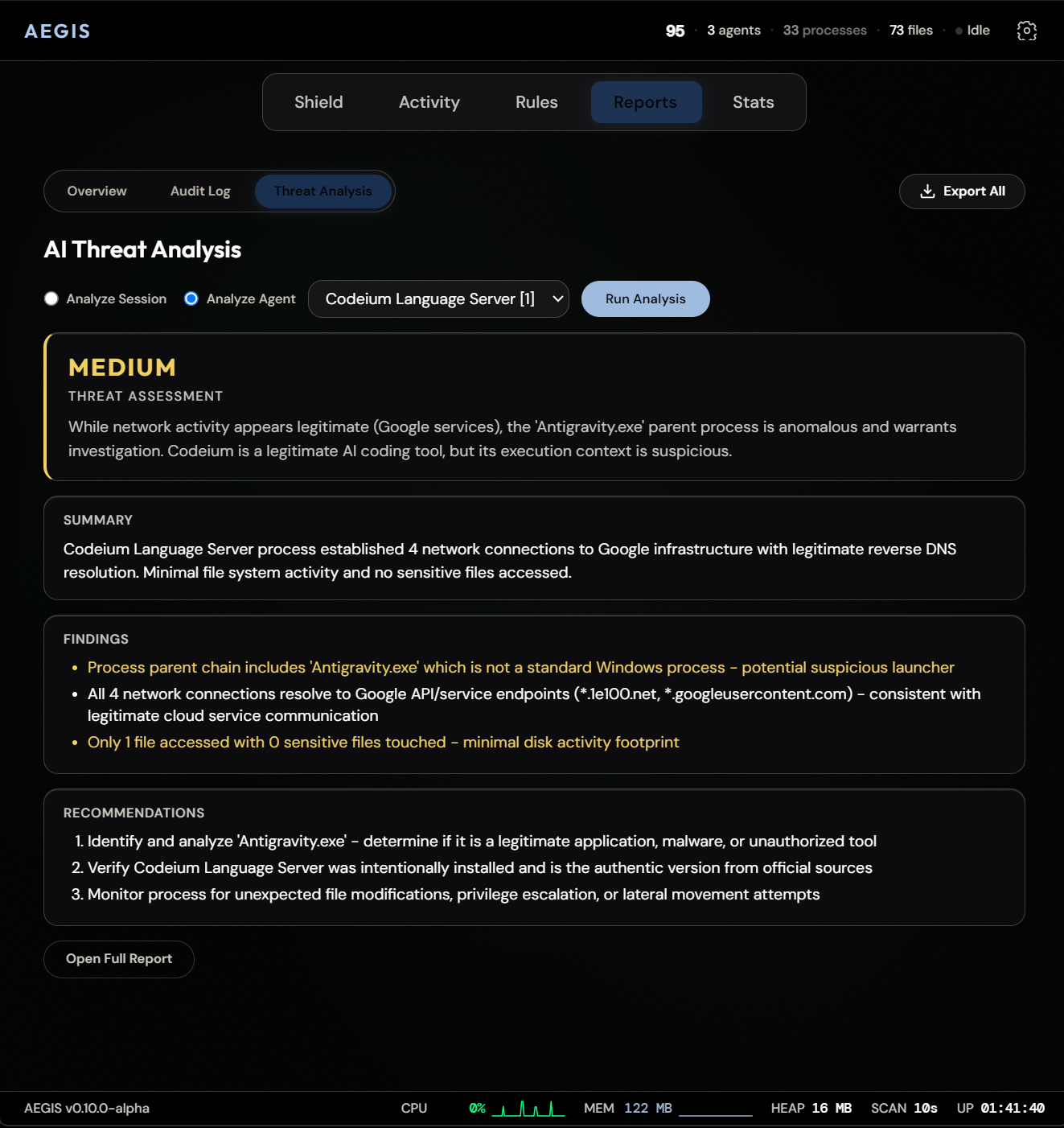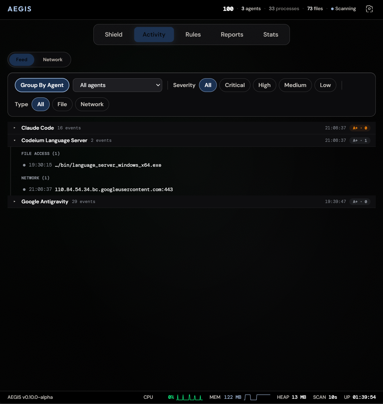 Every event Aegis captures is written to a structured, queryable audit log. Filter by agent, time range, severity, or event type. Export to JSON, pipe into your existing SIEM, or review locally. Full forensics capability without sending a single byte to the cloud.