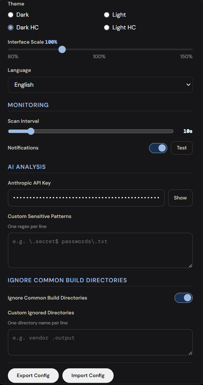 Uses inotify watchers for continuous monitoring of file reads, writes, creates, and deletes. Aegis flags access to sensitive paths -- SSH keys, .env files, browser credential stores, cloud configuration directories. Path pattern matching and ACL checks enforce configurable allowlists per agent.